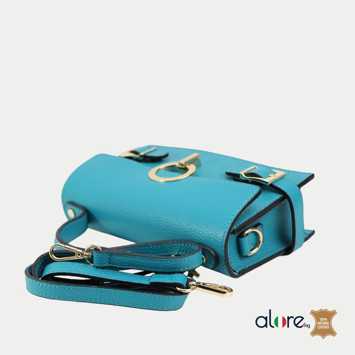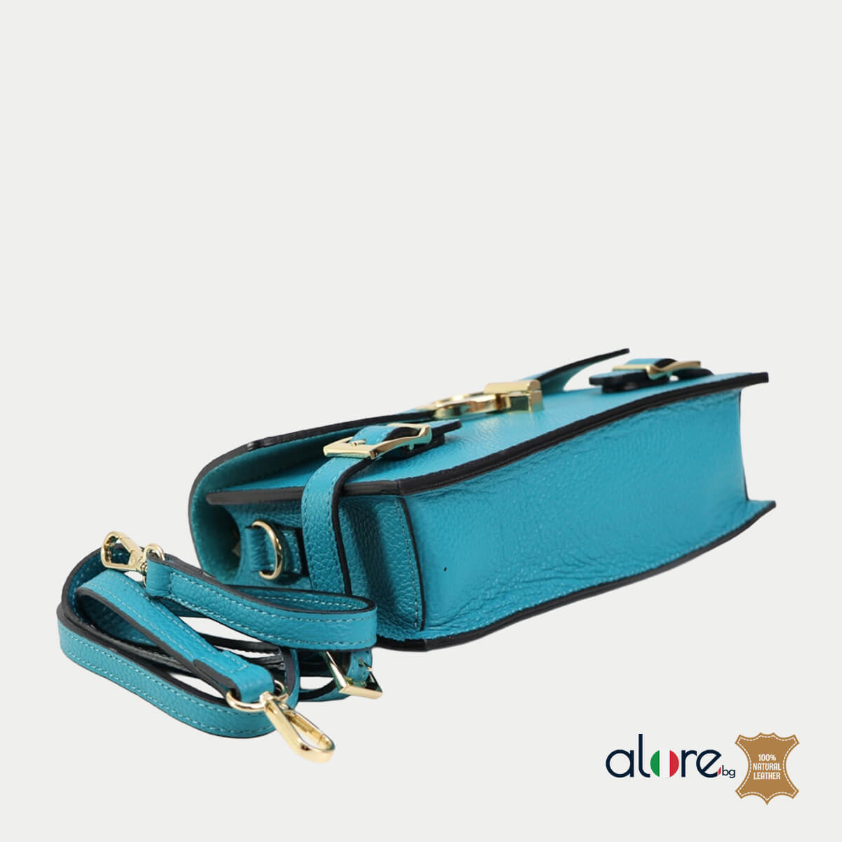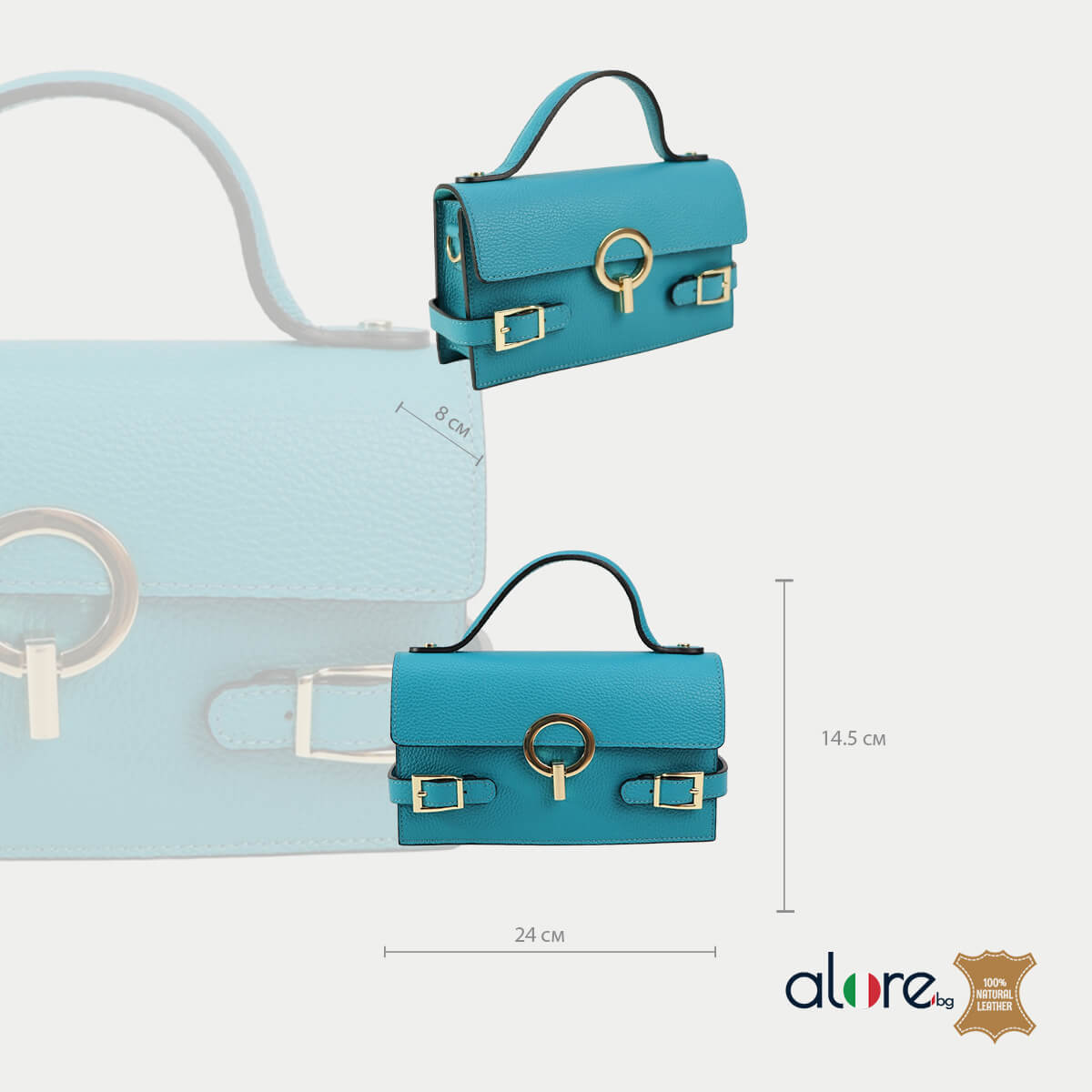 Със своите компактни, но практични размери – 24 см ширина, 14,5 см височина и 8 см дебелина, Dara в тюркоаз е идеалният спътник както за динамичното ежедневие, така и за стилни вечерни излизания. Едно основно отделение, затварящо се с елегантен капак и закопчалка, осигурява сигурност и удобство, а вътрешният джоб с цип е перфектното място за съхранение на ценни вещи и дребни аксесоари.