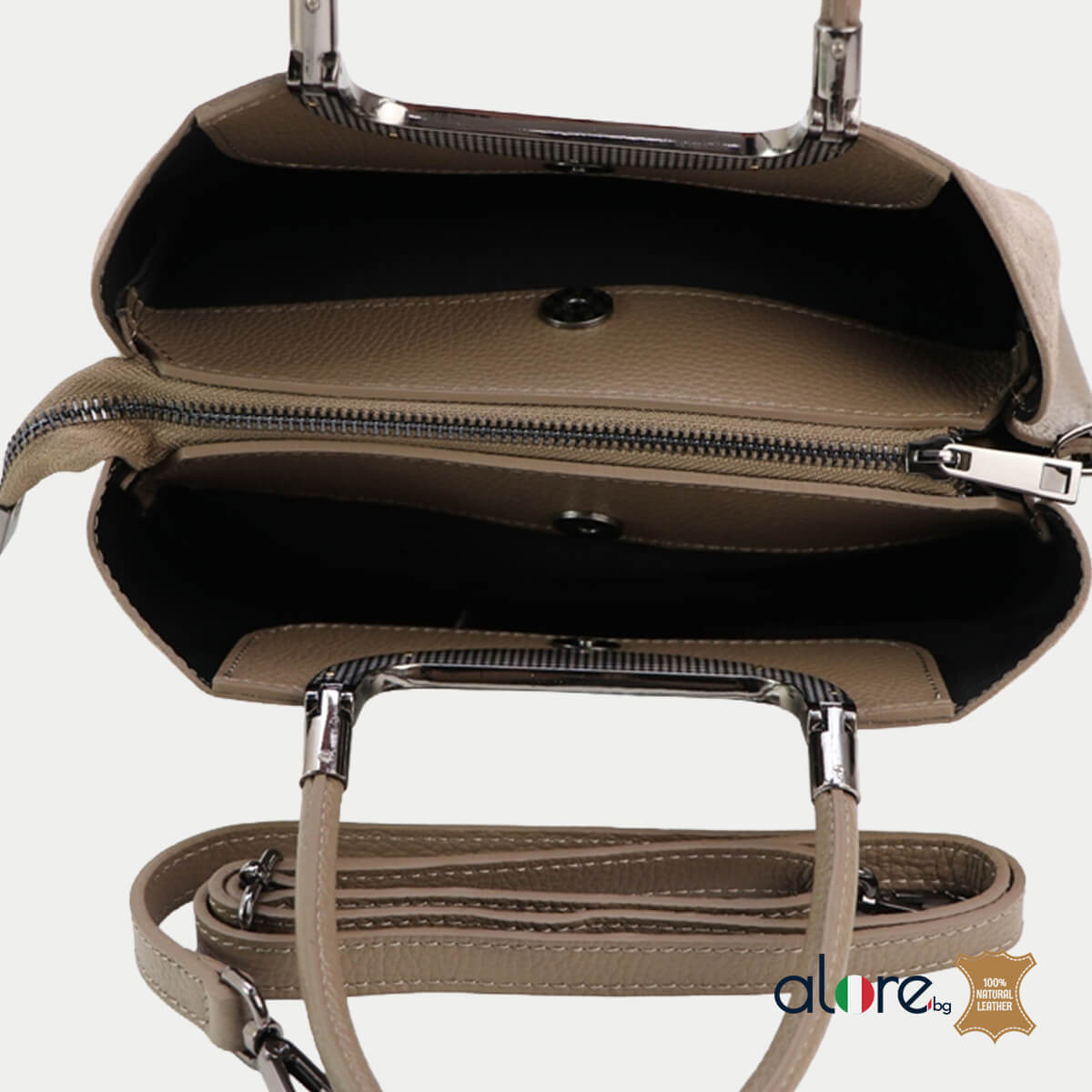 Моделът разполага с три отделения, като двете външни се затварят с магнитни копчета, а централното отделение – с цип, осигурявайки сигурност и добра организация. Вътре има допълнителен джоб с цип, подходящ за ключове, документи и ценни принадлежности.