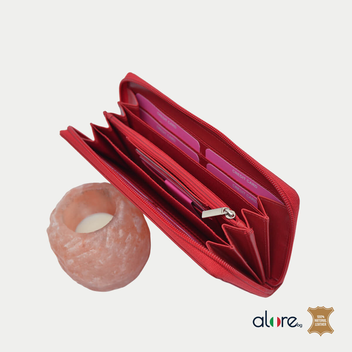 Портмонето разполага с четири отделения за банкноти, шестнадесет отделения за лични документи, карти и визитки, както и удобен вътрешен монетник с цип. Цялото портмоне се затваря сигурно с обиколен цип, гарантиращ комфорт и защита на съдържанието.