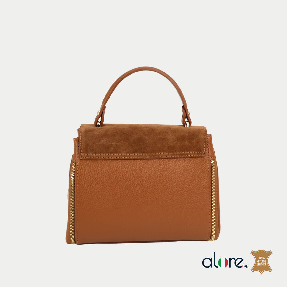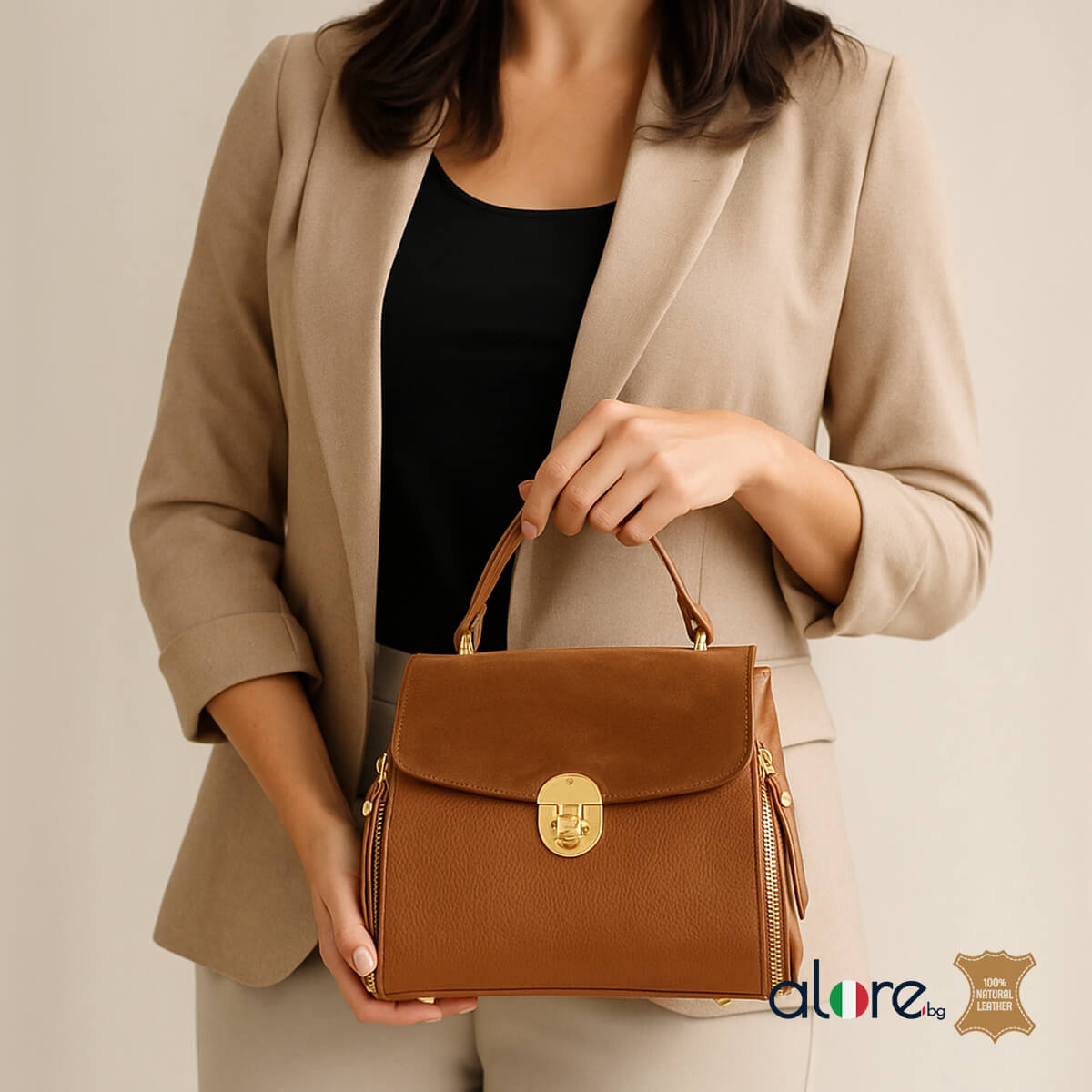 Металните елементи в златен цвят придават фин блясък и подчертават изискания облик на чантата. Топлият карамелен цвят я прави отличен избор за жени, които ценят стил, класа и практичност в ежедневието си.