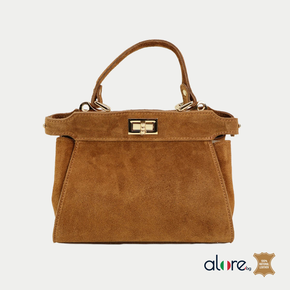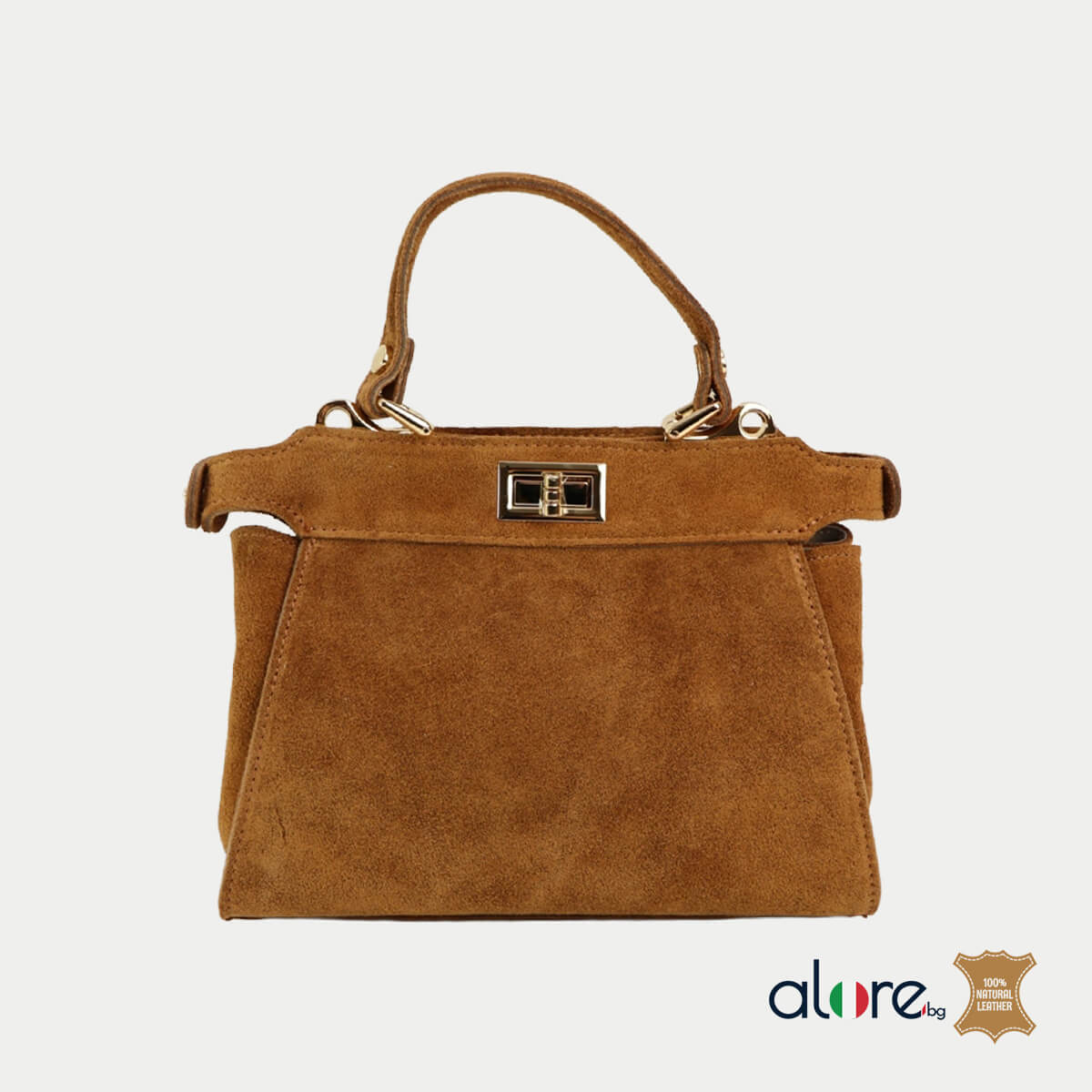 Елегантната дамска чанта от естествен велур впечатлява със своята изтънчена форма и прецизна изработка. Вътрешността е практично организирана в две отделения, които се затварят с метални закопчалки, осигурявайки удобен и лесен достъп до личните вещи.