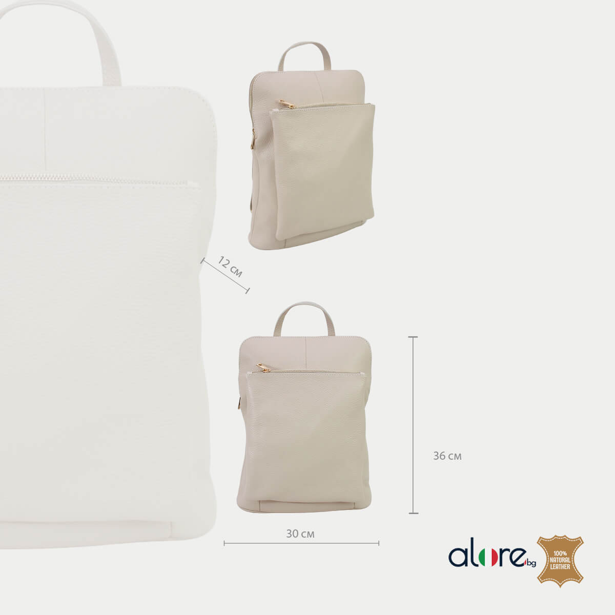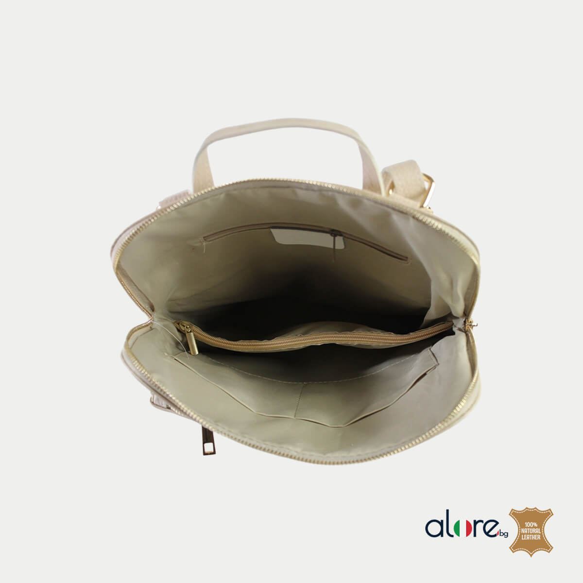 Разполага с три вътрешни отделения, средното от които се затваря с цип. Раполага с 2 отделения за телефон, и едно за документи. За по-голяма сигурност цялата раница се затваря с един общ цип. Разполага с 2 външни джоба (отпред и отзад), които отново са защитени чрез цип. Металните елементи са в златисто.